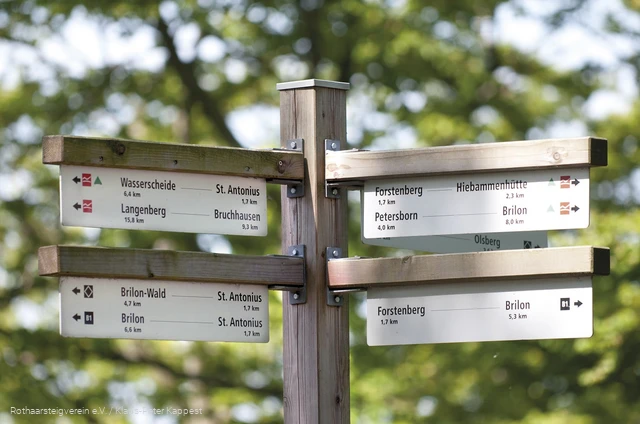 In Brilon, der alten Hansestadt und zugleich waldreichsten Stadt Deutschlands, beginnt der Rothaarsteig. Vom Marktplatz, vor dem historischen Rathaus führt der Weg durch die Stadt in den Wald. Mit der Möhnequelle am Osthang des Poppenbergs (605 m) steuert der Rothaarsteig die erste vieler namhafter Quellen im Rothaargebirge an. Im sogenannten Bürgerwald wurden auf private Initiative nach dem Sturm Kyrill im Jahre 2007 bis heute mehr als 500.000 Bäume von rund 30 verschiedenen Baumarten gepflanzt. Nach dem Borberg (670 m) mit wunderbarer Aussicht verläuft der Rothaarsteig über die Ginsterköpfe, einem relativ steilen Abschnitt, der besonders sportlich Wandernden Freude bereitet. Von hier hast du einen herrlichen Blick hinüber zu den Bruchhauser Steinen. Nach dem Kunstwerk „Feuereiche“ stehst du am Fuße der imposanten Felsen. Über den Richtplatz und den Rothaarsteig-Zugangsweg geht es schließlich nach Willingen.